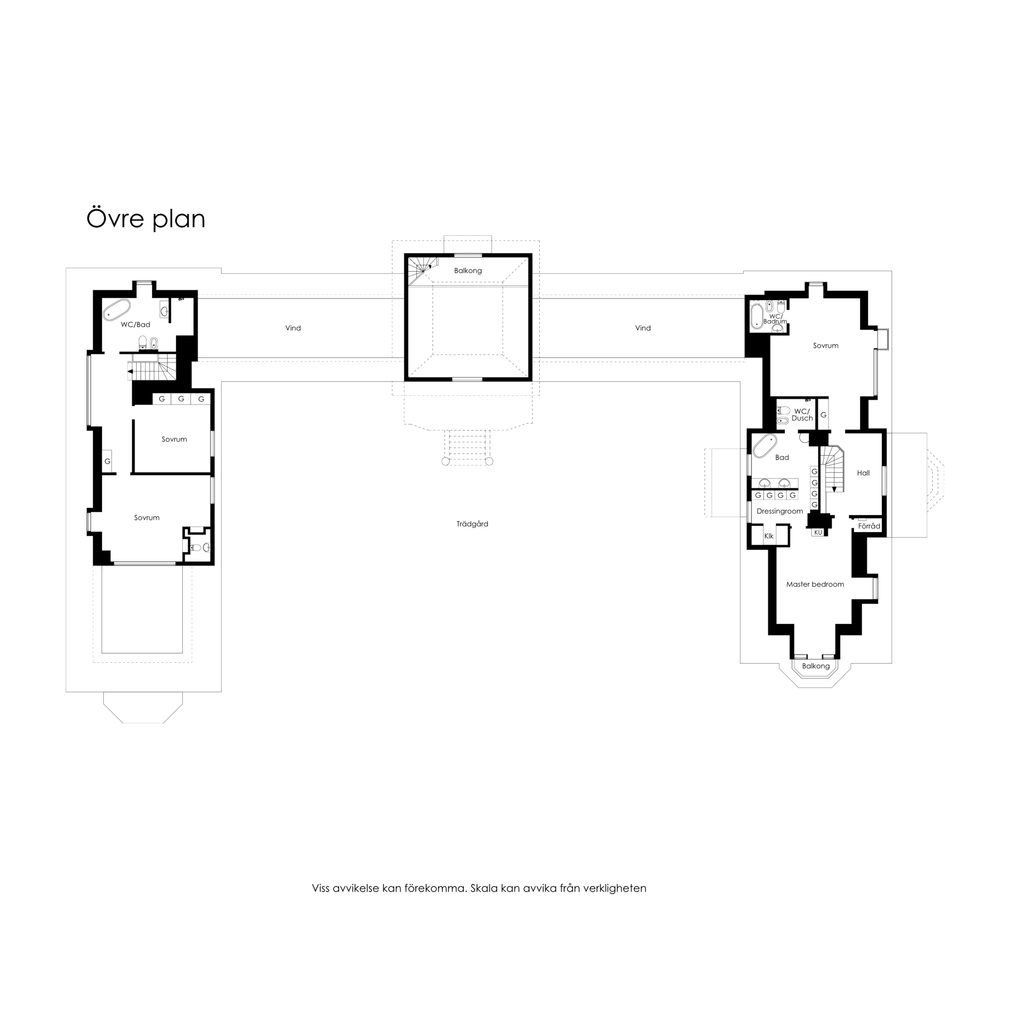 På det övre planet i östra flygeln finner vi Master bedroom, ett harmonisk rum med kakelugn och en privat balkong för att njuta av vacker utsikt. Panelen med dörröppnare ger en elegant touch till rummet, medan golvet pryds av kilsågad gran för en tidlös atmosfär. En intilliggande dressing room erbjuder gott om plats för förvaring och klädupphängning.
