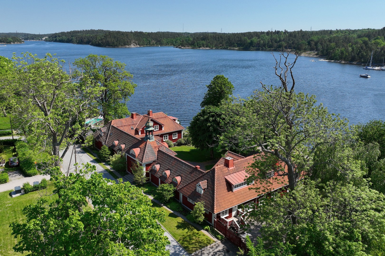 Den parkliknande tomten smälter harmoniskt samman med omgivande natur och sluttar mjukt ned mot vattnet, flankerad av två 1700-tals paviljonger. Beläget endast 20 minuters bilresa från Stockholms pulserande Stureplan, kombinerar stadslivets bekvämligheter med skärgårdens lugn och skönhet.