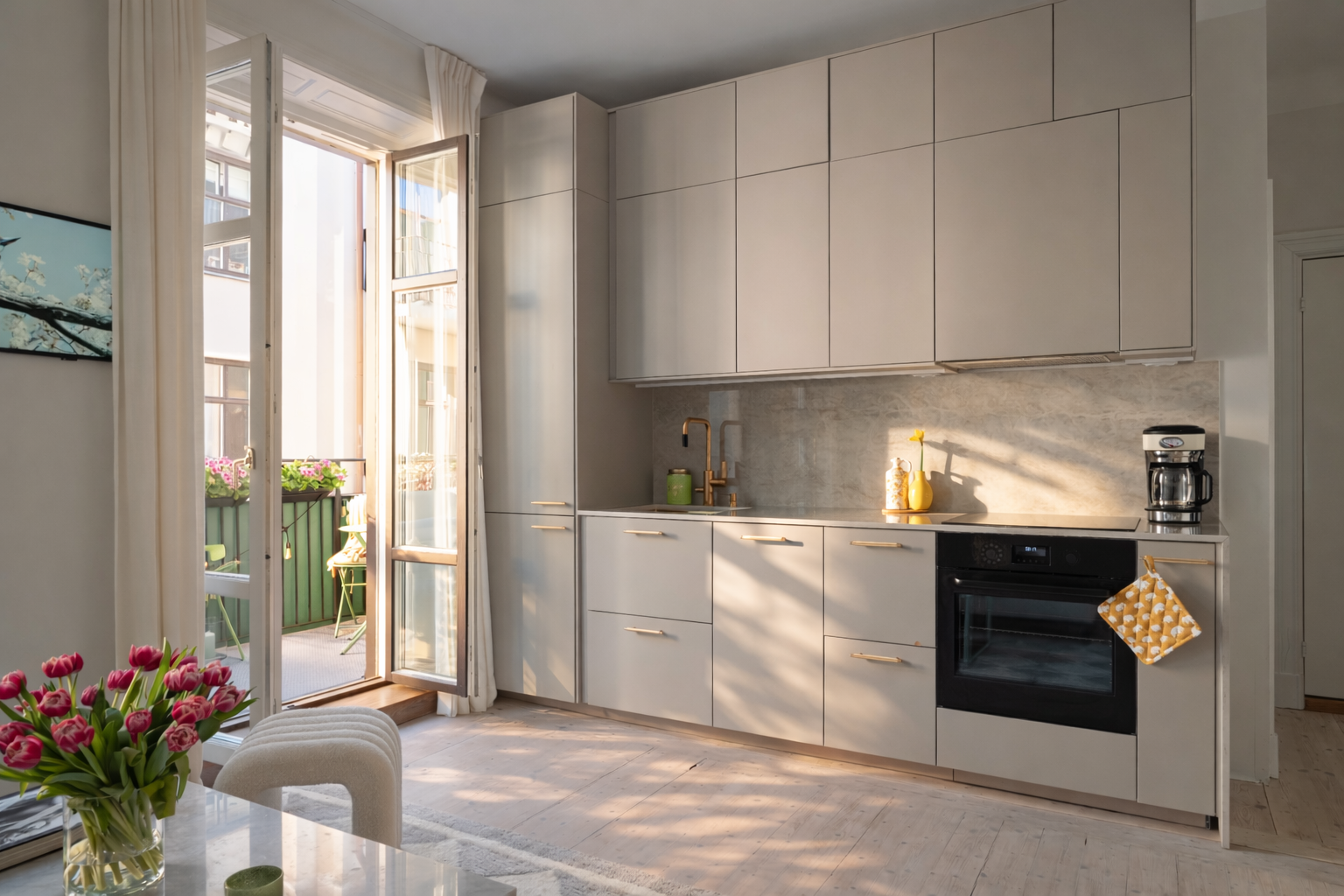 Ett stilrent och genomtänkt hem där varje detalj präglas av kvalitet och estetik. Köket är elegant utformat med en exklusiv kompositskiva och armatur från Tapwell Sovrummet vetter mot en lugn innergård, kompletterat med platsbyggd förvaring som optimerar ytan på ett smakfullt sätt. I entrén möts du av specialtillverkad platsbyggd förvaring av finsnickare, vilket ger karaktär och goda förvaringsmöjligheter. Badrummet är inrett i sobra, tidlösa toner med eleganta mässingdetaljer. Möjlighet att installera kakelugn som tidigare varit placerat i bostaden.