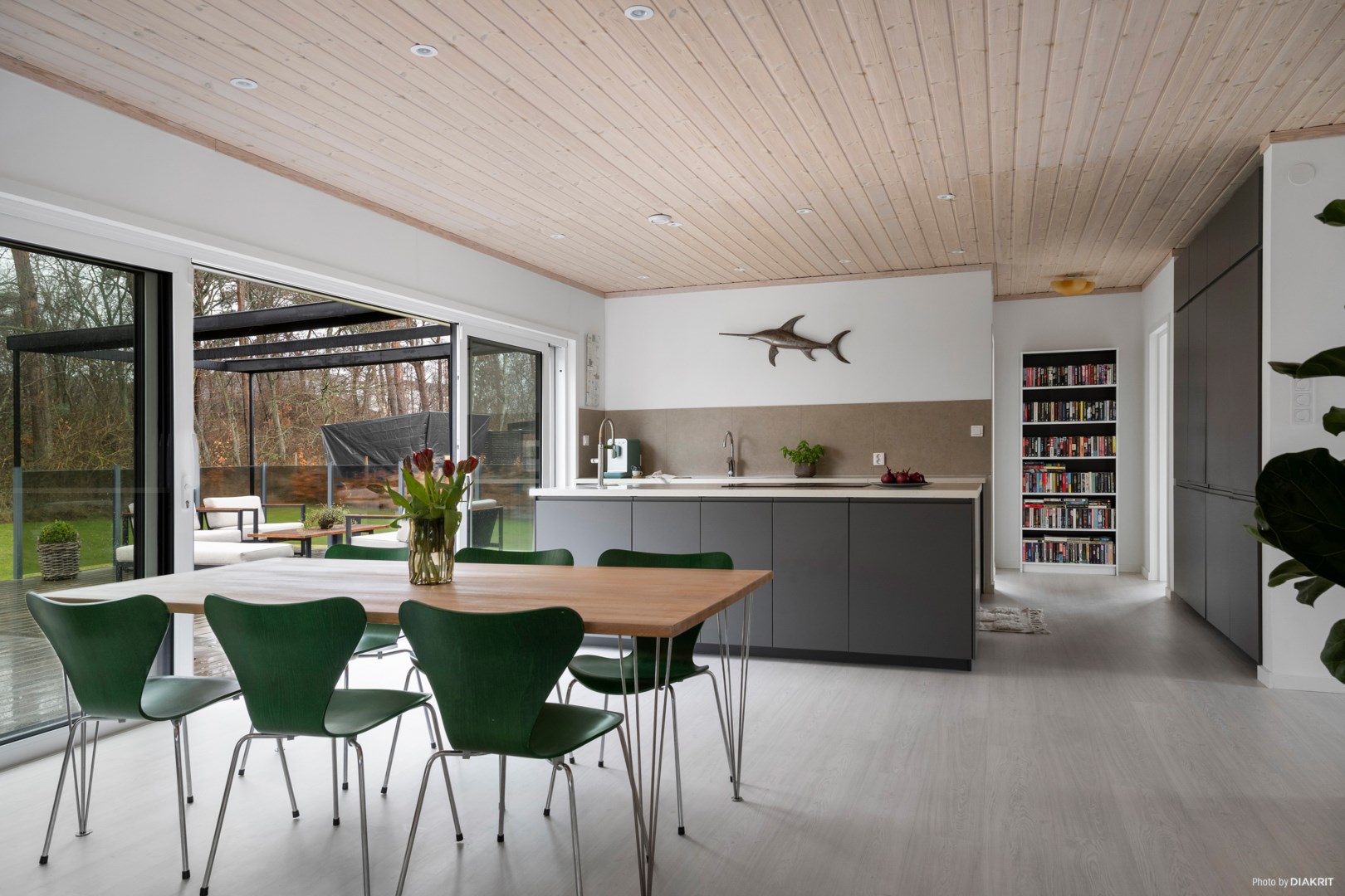 Rakt fram från hallen ligger det kombinerade köket och vardagsrummet som går i öppen planlösning. Rummet har ett härligt ljus och rymd tack vare den generösa takhöjden och alla fönsterpartier. I rummet finns en mysig braskamin och de stora skjutpartierna öppnar upp mot altanen i trädgården. I det moderna köket finns det generöst med skåp för förvaring. Härifrån kliver du direkt ut på en stor altan som är perfekt för lata sommardagar. Här kan du sträckläsa en bok, grilla, ta en kopp kaffe eller bara blunda och vända dig mot solens värmande strålar och njuta middagar under bar himmel.