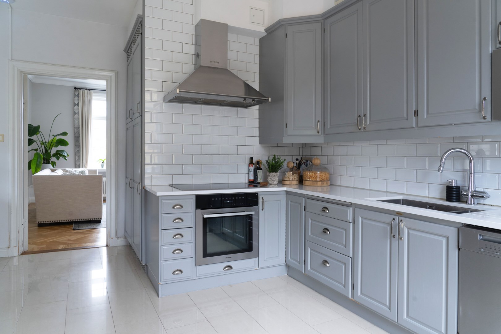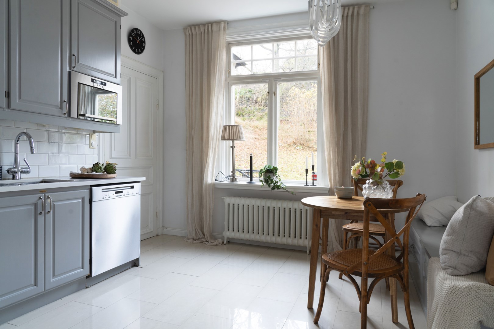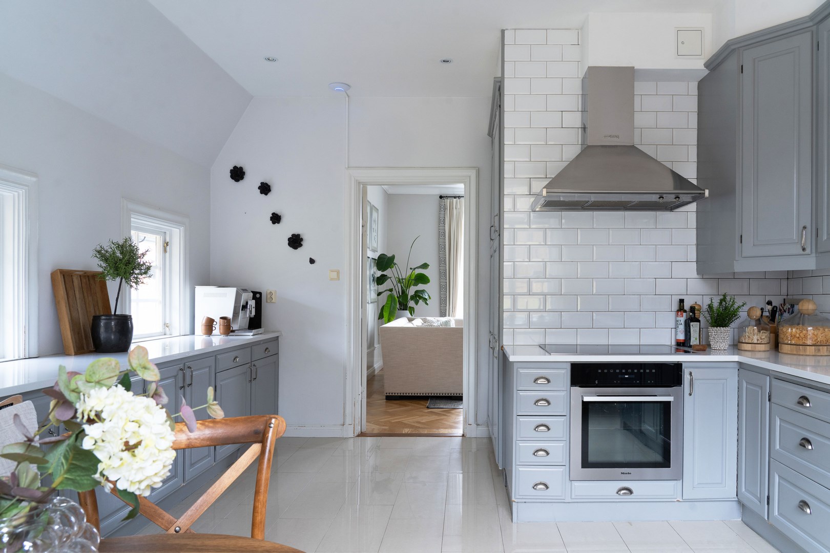 Lantkök i mörkt grått, Kvänum och maskinell utrustning som spis, ugn, fläkt, integrerat kylskåp och frys samt diskmaskin. Ljusa bänkskivor och på golv stora ljusa klinkerplattor. Det ljusa klinkergolvet går igen i den inre hallen och även i källaren för enhetlig design. Intill hall en gästwc i engelsk stil och fina material som handfat från Burlington.
