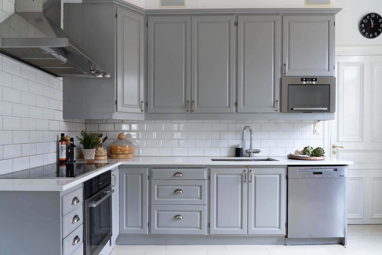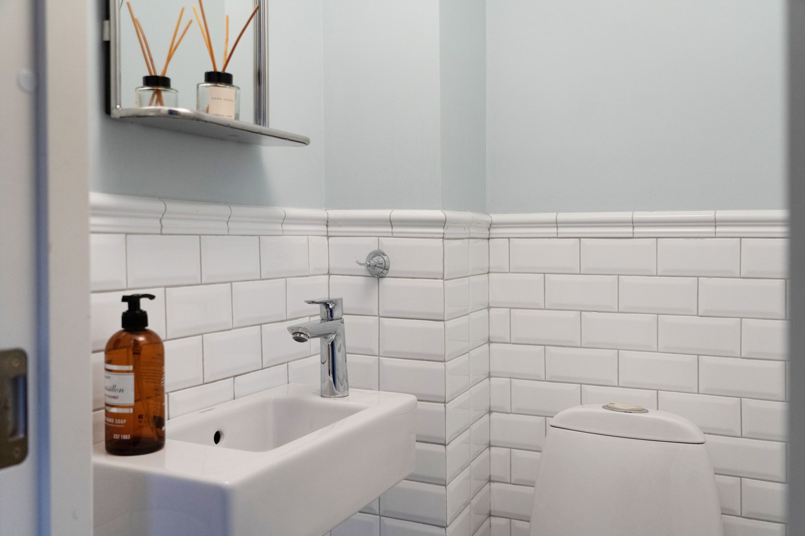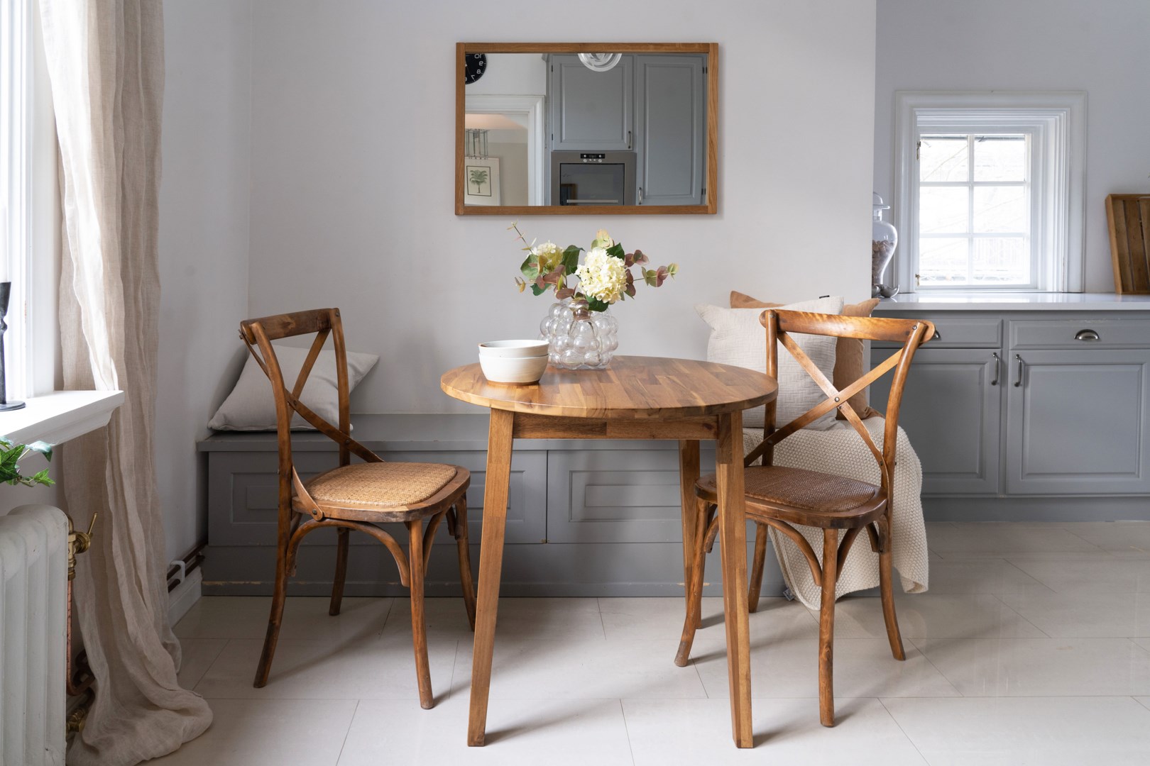 Lantkök i mörkt grått, Kvänum och maskinell utrustning som spis, ugn, fläkt, integrerat kylskåp och frys samt diskmaskin. Ljusa bänkskivor och på golv stora ljusa klinkerplattor. Det ljusa klinkergolvet går igen i den inre hallen och även i källaren för enhetlig design. Intill hall en gästwc i engelsk stil och fina material som handfat från Burlington.