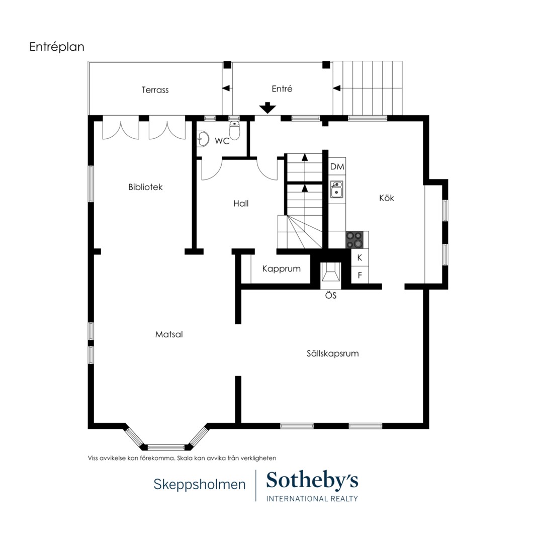 Den yttre hallen leder in till en större hall med ett generöst kapprum. Genom pardörrar nås matsalen och här slås man av det höga läget och den vidsträckta utsikten genom burspråkets fönster. Genom ett stort nyupptaget fönster mot söder ses Stora Värtan och här plats för ett större middagssällskap. Intill ett sällskapsrum vilket kan användas som ett bibliotek/ arbetsrum och genom glasdörrar utgång till den stenbelagda terrassen i västerläge. I fil med matsalen ett större sällskapsrum med stora fönster och spröjs upptill och vidsträckt utsikt även här. Öppen spis och plats för en soffgrupp och läshörna. På golv fiskbensmönstrad ekparkett i den inre hallen, sällskapsrummen och matsalen.