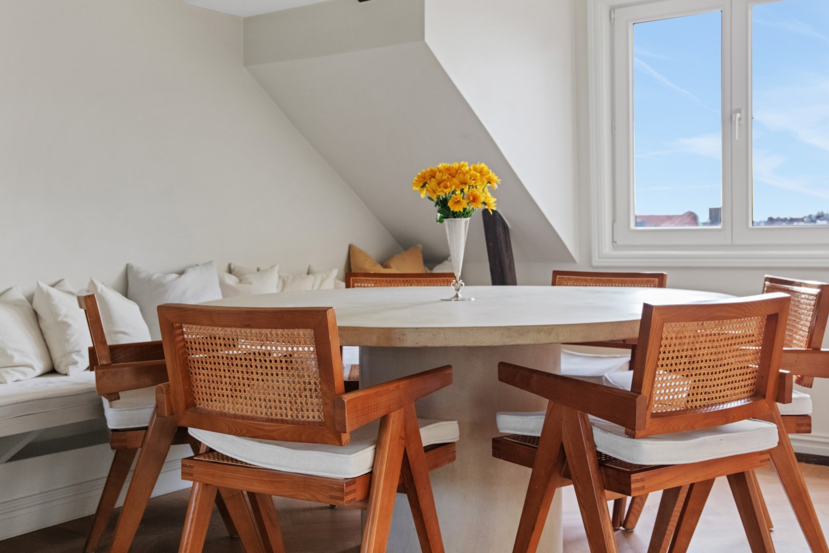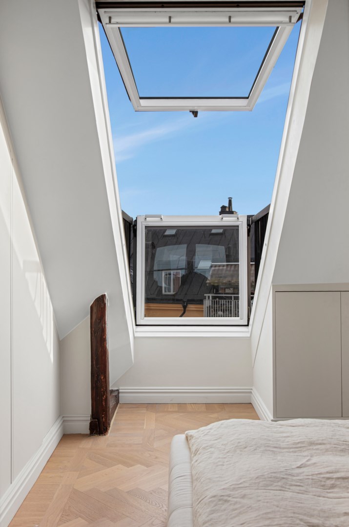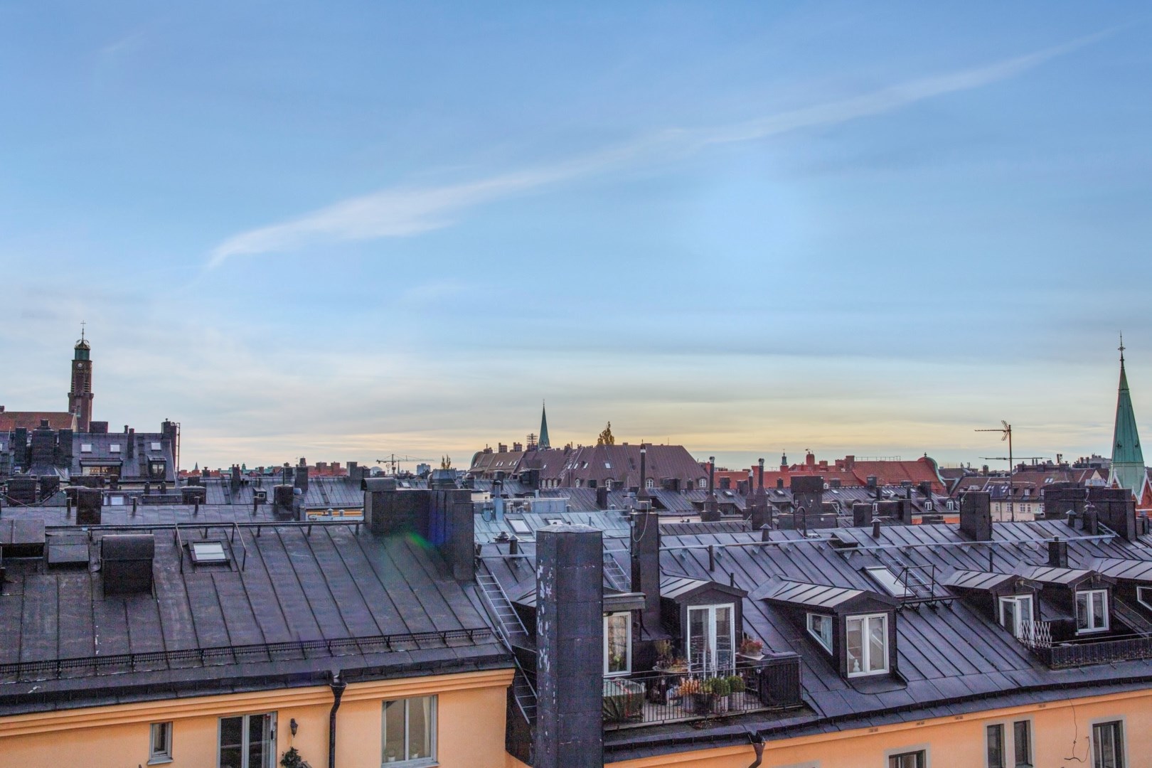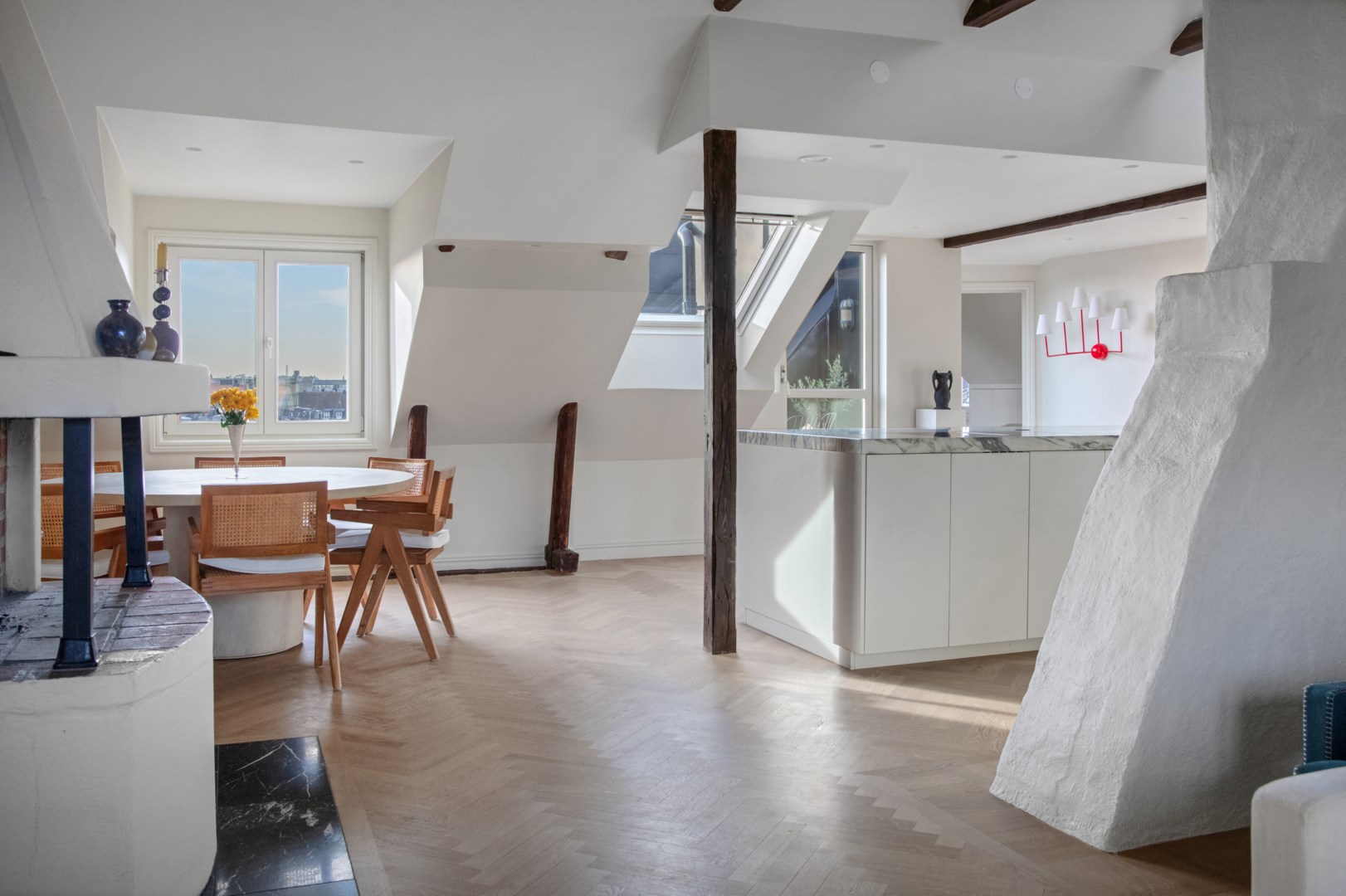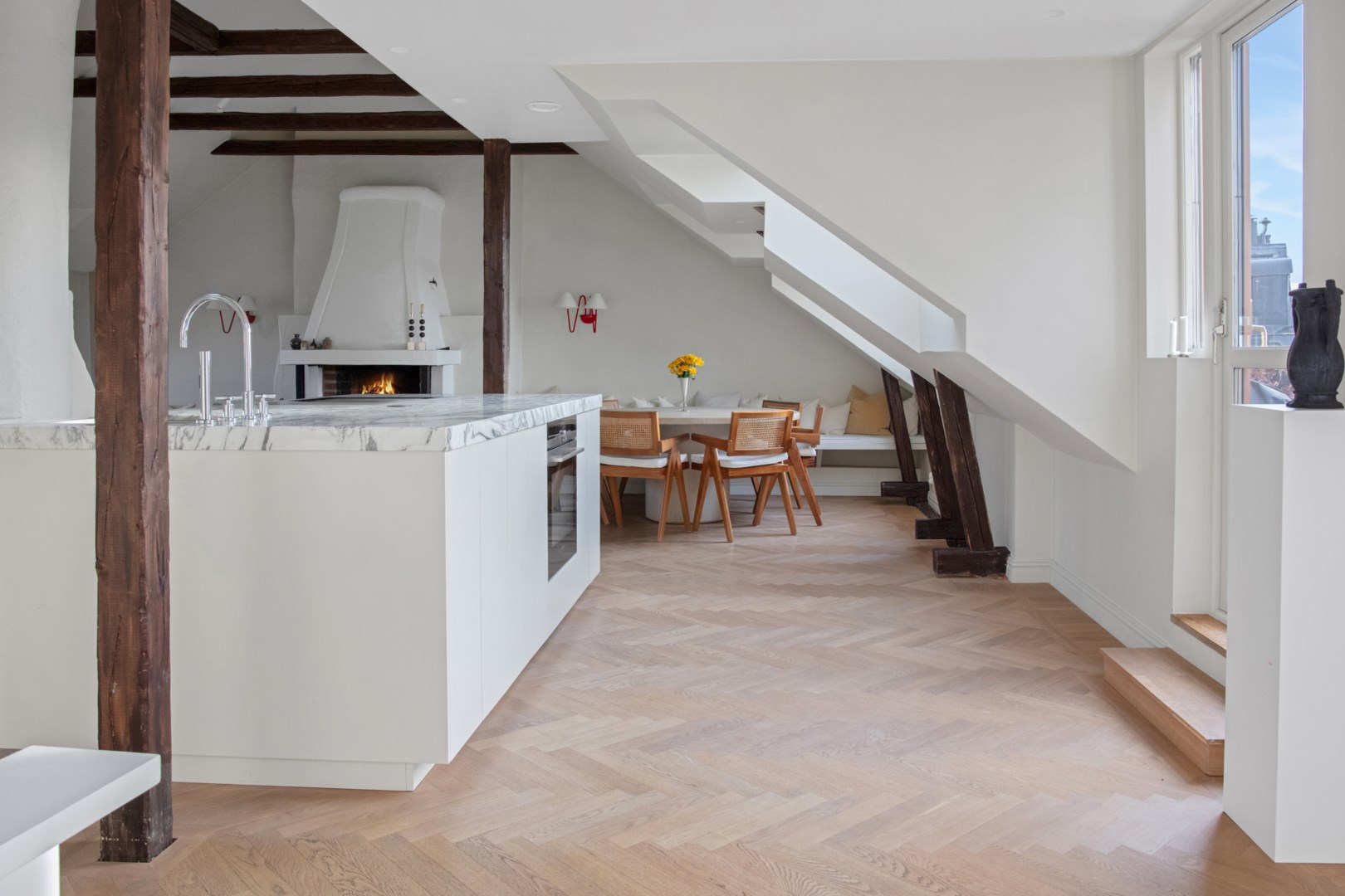 Topprenoverad vindsvåning om totalt 126 kvm med genomgående exklusiva materialval och en design utöver det vanliga! Optimerad planlösning med fönster i alla fyra väderstreck. Så snart man stiger in genom dörren till denna vindsvåning slås man av ljuset och rymden. Ett stort sällskapsrum och kök i öppen planlösning som flödar i ljus tack vare sin genomgående planlösning med fönster i dubbla väderstreck och flera takfönster. I centrum står den imponerande eldstaden som bidrar med ljus och värme året runt. Köket domineras av en stor köksö med generösa arbetsytor. Köket har en avskalad elegans med exklusiva material och vitvaror. I direkt anslutning till köket ligger utgången till takterrassen med en fantastisk utsikt över Stockholms skyline. Våningen rymmer tre sovrum, alla med sin unika karaktär och design. Att kliva in i badrummet känns som att kliva in i ett lyxigt hotell med marmor på väggar och golv, utsökt design och funktion. Här återfinns även en integrerad tvättpelare. Ett separat gäst-wc ligger i direkt anslutning till entrén. I entrén finns även uppgång till ett mindre loftrum som med fördel kan användas som hemmakontor. Ett unikt tillfälle för den som vill bo högst upp i en sekelskiftesfastighet från 1909, nära till både natur och Stockholms rika stadsliv. Utmärkta kommunikationer med tunnelbanan (Tekniska Högskolan) inom 2 minuters promenad!