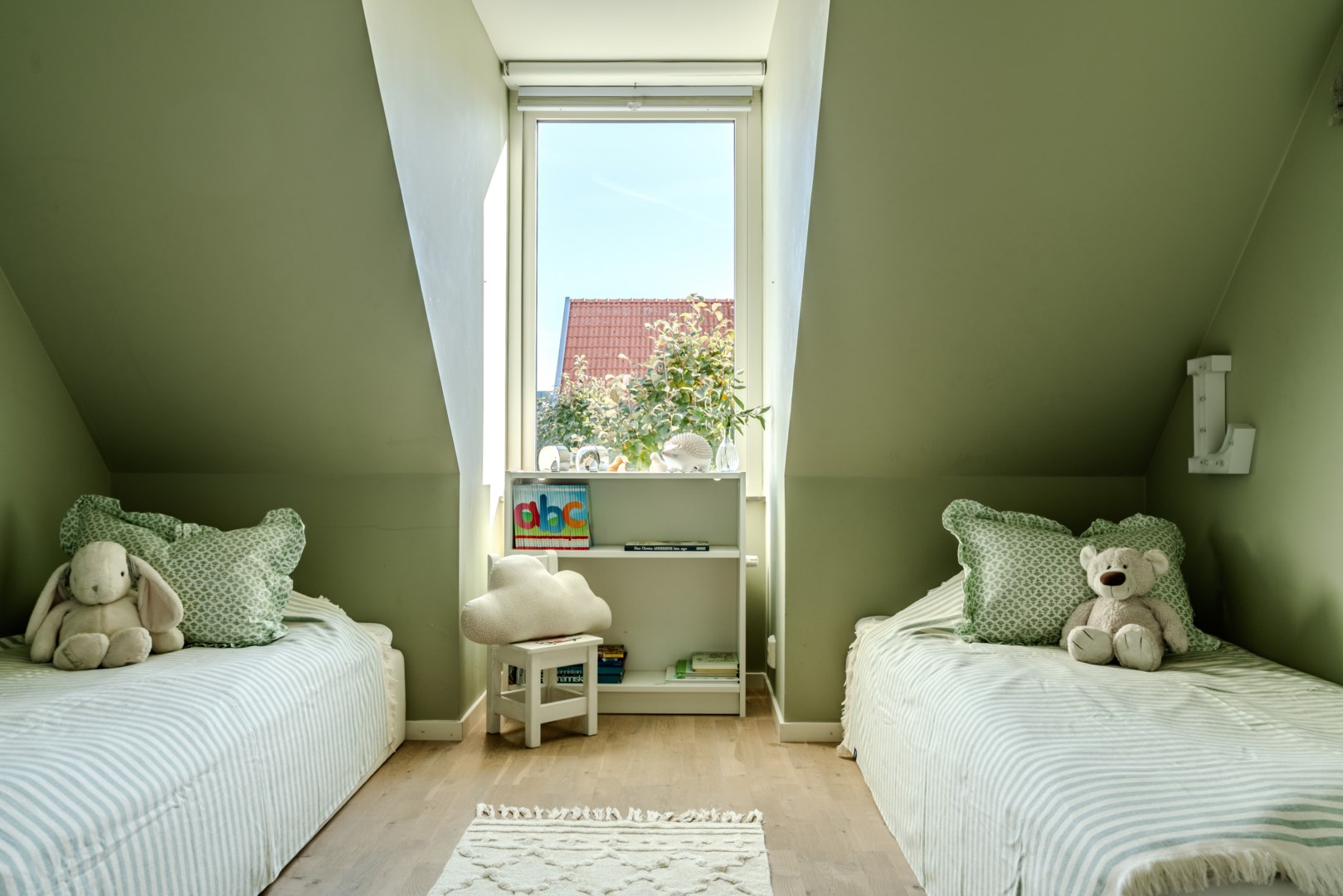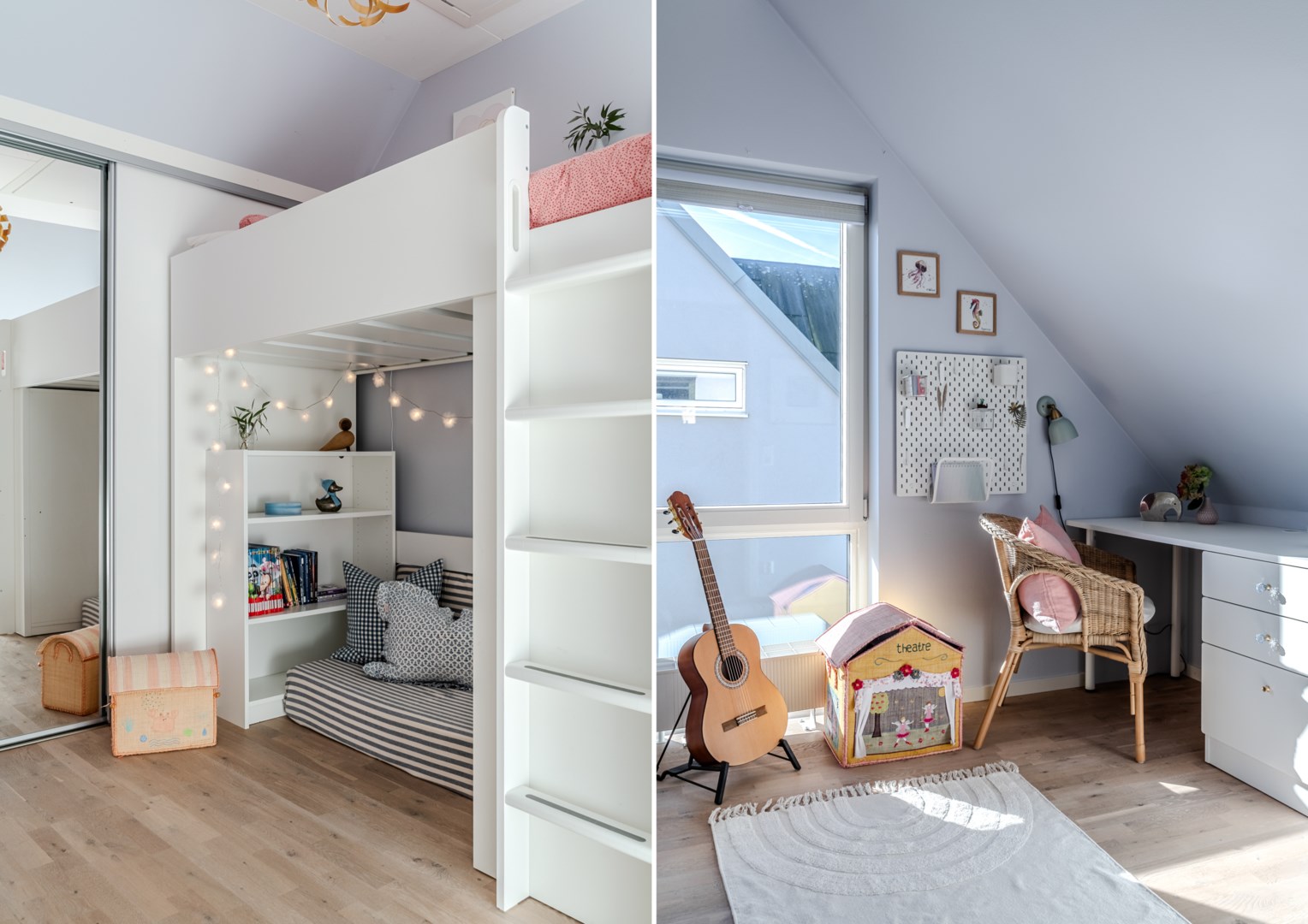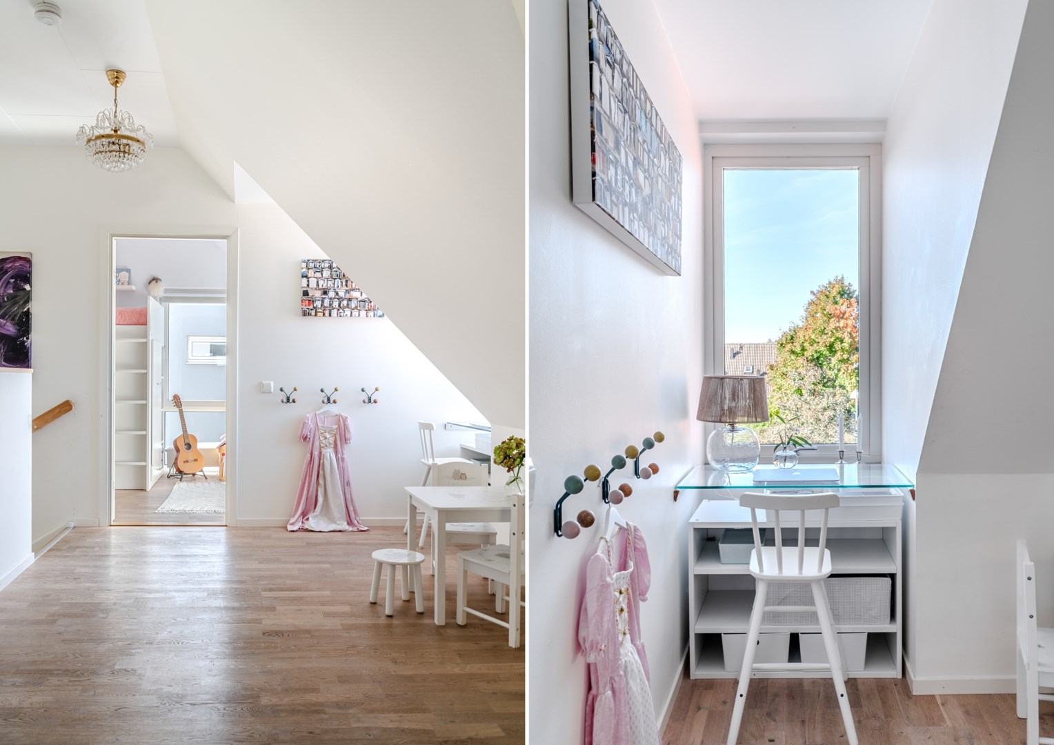 En stilren trappa leder upp till övre plan, där familjens privata del tar vid. Här finns ett centralt allrum, tre rymliga sovrum samt en lek/arbetshörna med fönsternisch och utsikt över höga lövträd. Badrummet är inrett med fristående ovalt badkar – en plats för avkoppling och stillhet.