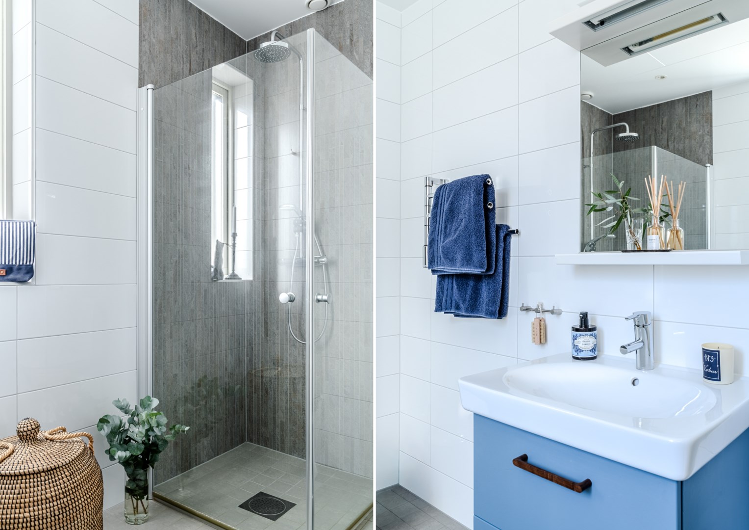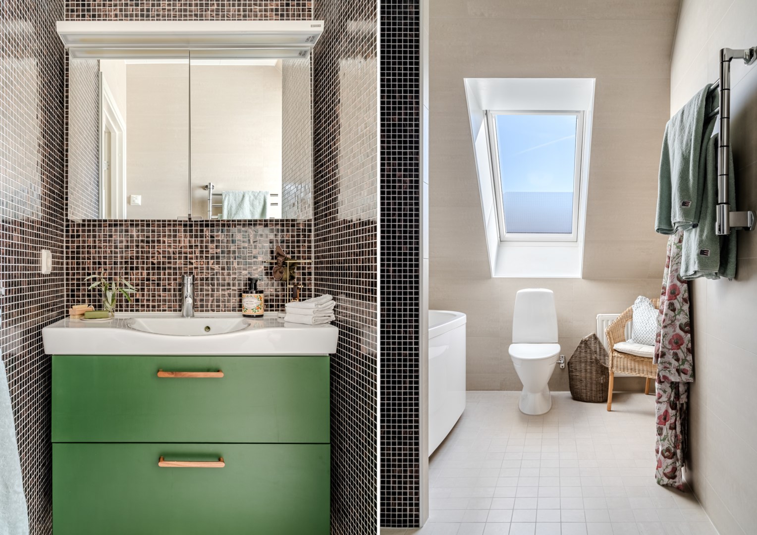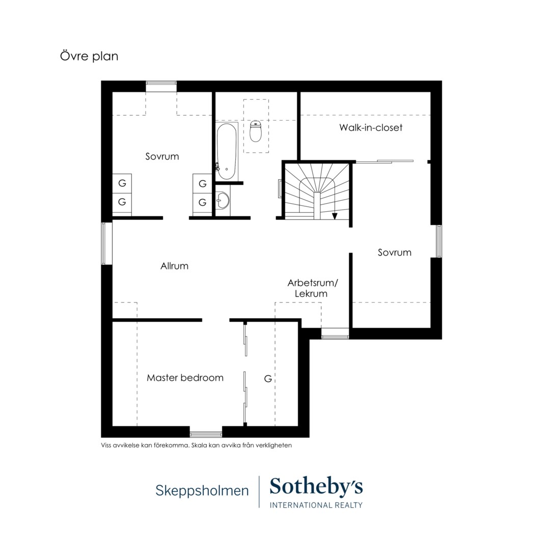 En stilren trappa leder upp till övre plan, där familjens privata del tar vid. Här finns ett centralt allrum, tre rymliga sovrum samt en lek/arbetshörna med fönsternisch och utsikt över höga lövträd. Badrummet är inrett med fristående ovalt badkar – en plats för avkoppling och stillhet.