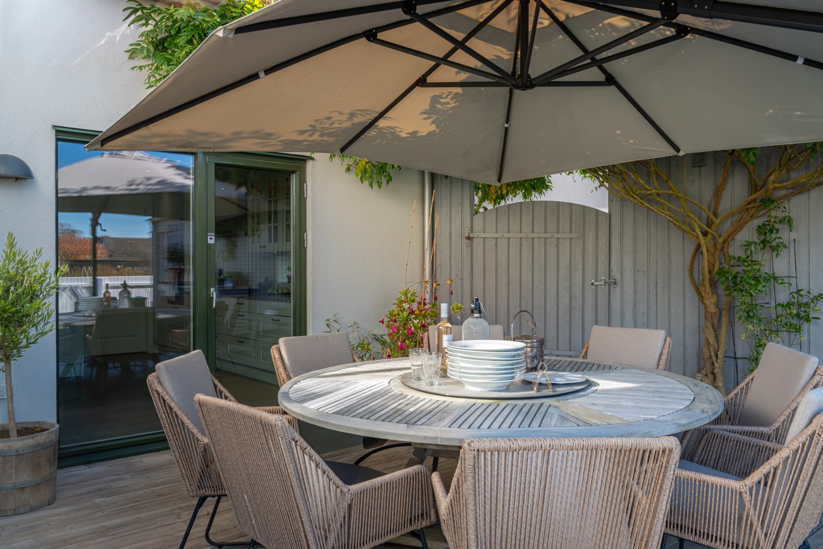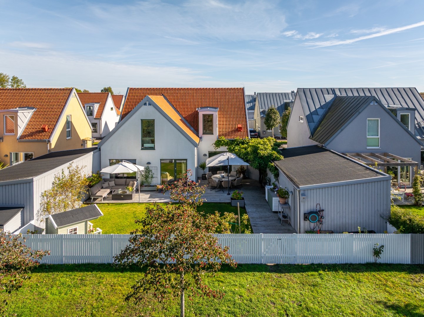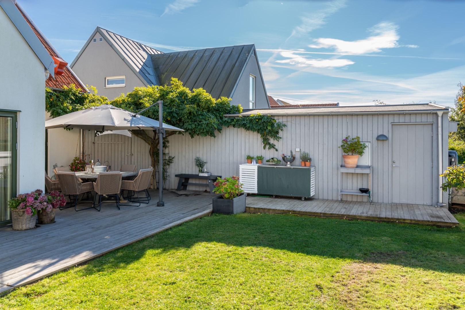 Trädgården är en grön oas med generös träaltan i sydvästläge, inramad av lummig växtlighet: bl.a. vinrankor, äppleträd, pallkragar för jordgubbar och medehavsörter samt ett träd av ärtbuske som bildar ett tak över utematplatsen. Här finns plats för både middagar under pergolan i solnedgången, sommardrinken, barnens lek och stilla stunder i solen. Alldeles utanför trädgården finns ett grönområde med promenadstråk, vilket gör att huset har utsikt över vackra lövträdkronor från båda våningsplan – likaså från nedre plan då huset byggdes upphöjt högt beläget. Från den privata uppfarten når man garaget och från trädgården nås det isolerade förrådet. Markis är förberett för över uteplatsen (el framdraget samt förstärkning i husväggen). Biogas är framdraget till uteplatsen, förberett för gasolgrill, samt om gasspis önskas i köket.