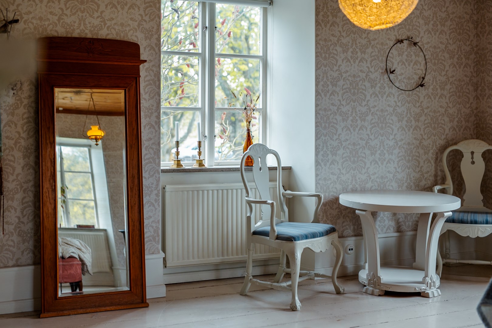 Välkommen till en plats där varje fönster vetter mot stillhet – och varje rum bär på sin egen berättelse. Stilfulla original detaljer – synliga takbjälkar, kalkstensgolv, kalkputsade väggar och handgjorda snickerier – samspelar med moderna renoveringar där inget lämnats åt slumpen. I samlingsrummen skapar generösa takhöjder och stora fönster en luftig, naturlig elegans. En fungerande eldstad och klassiska kalkstensomfattningar ger gården sin varma, välkomnande karaktär. Fastigheten har under många år drivits som boutiquehotell med ett starkt varumärke och återkommande gäster.