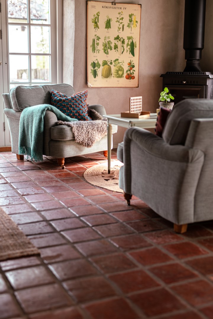 Vackert klinkergolv där trappan går upp till vånings 1 – öppet mot kök med matrum samt lounge och rum 7. "Rum 7" är placerat i entréplanet nära köket, rummet är mysigt med kalkstenen i dager och en lite hall med dörr ut till uteplatsen