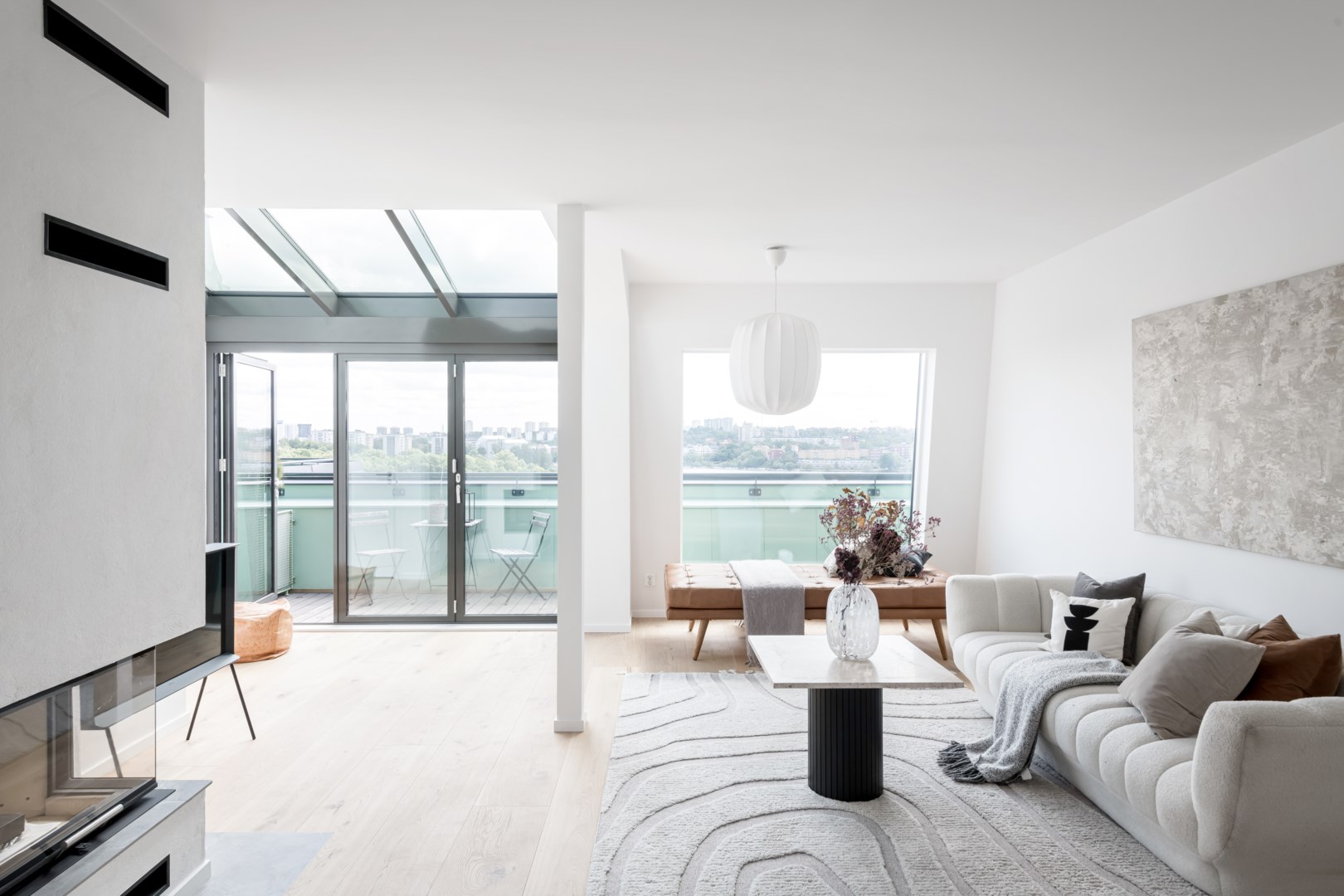 Välkommen till denna etagevåning med terrasser om cirka 60 kvm både uppe och nere i två väderstreck för härliga utomhusmiddagar, sommarodlingar och umgänge. Bostaden erbjuder fri utsikt i soligt söderläge med fri utsikt över glittrande vatten. Ett välplanerat boende med generösa terrasser i flera väderstreck som förlänger bostaden och skapar plats för både avkoppling och umgänge. 2 sovrum och på övre plan ett öppet arbetsrum. Exklusivt kök från SieMatic och vitvaror från Miele. Den öppna spisen är centralt planerad i vardagsrummet för härliga stunder framför brasan. Bostaden värms upp med vattenburen golvvärme som ger en behaglig inomhusmiljö året om. Föreningen har god ekonomi. Avgiften sänktes i juli 2025 med 10 %.